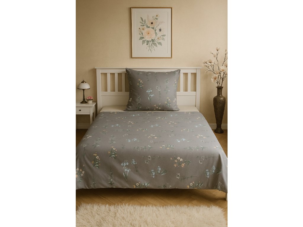 Bavlněné povlečení, jednolůžko - Luční kvítí šedé