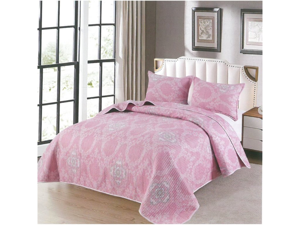 Bavlněný přehoz přes postel na dvojlůžko s 2 povlaky na polštáře - Růžový ornament
