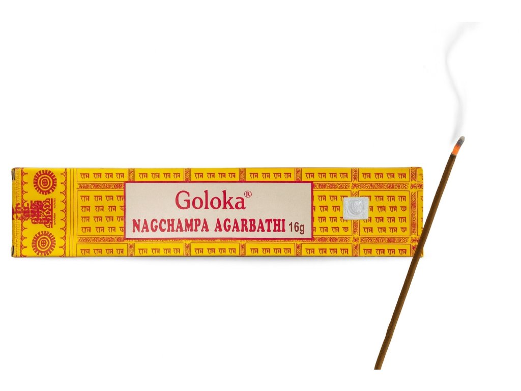 Vonné tyčinky s uklidňující směsí vůně květin a santalového dřeva Goloka Nagchampa Agarbathi. Unikátní indické vonné tyčinky od výrobce Goloka, na bambusové štěpině, vyrobené ze směsi bylin, medu, pryskyřic a olejů.
