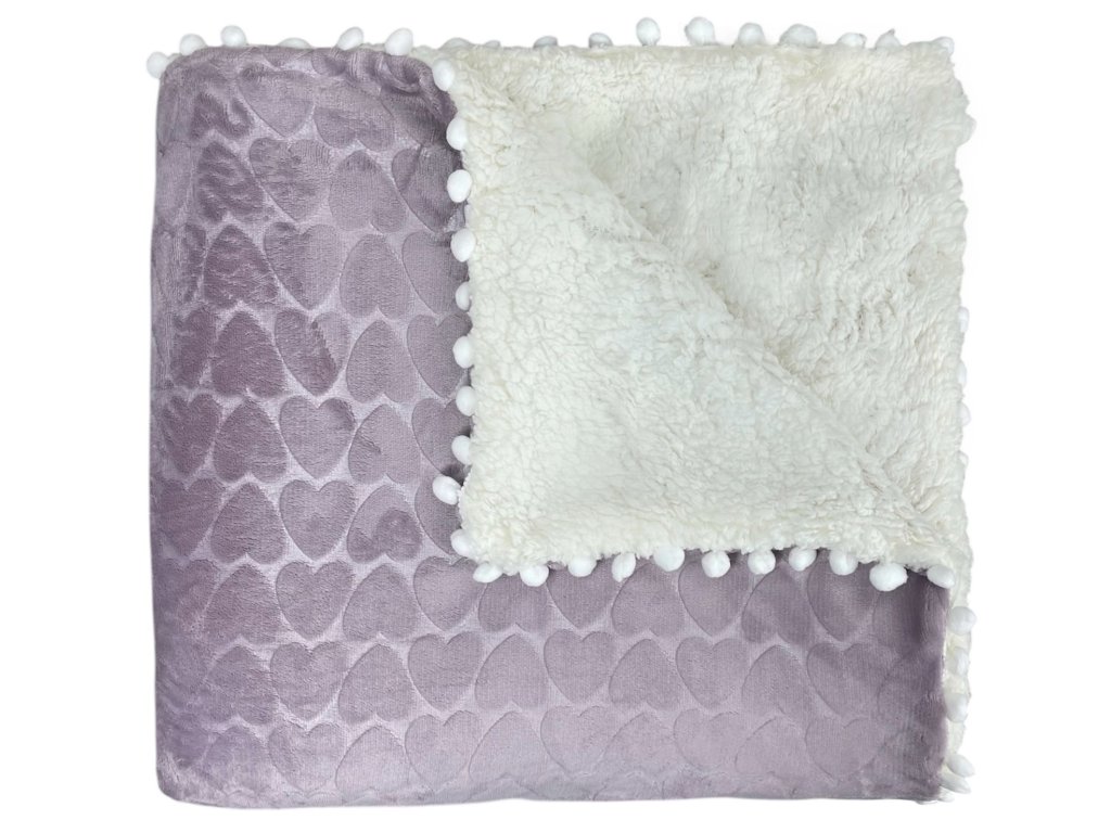 Beránková deka Srdíčka s bambulky 200 x 230 cm - Fialová