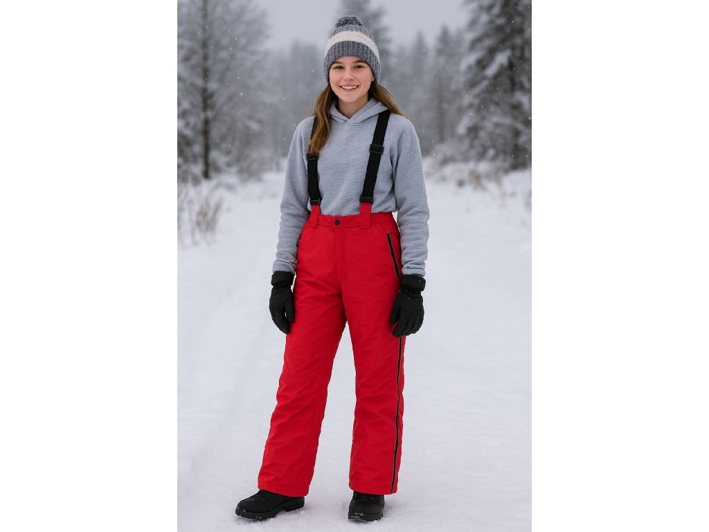 Dívčí červené oteplovačky s kšandami – ideální na hory a zimní radovánky.