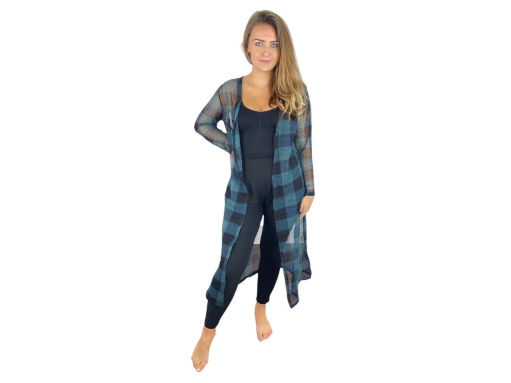 Elegantní dlouhý kardigan - kostkovaný zelený