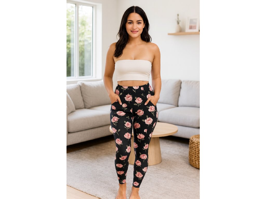 NOVINKA- Dámské dlouhé legíny černé se světle růžovým květem