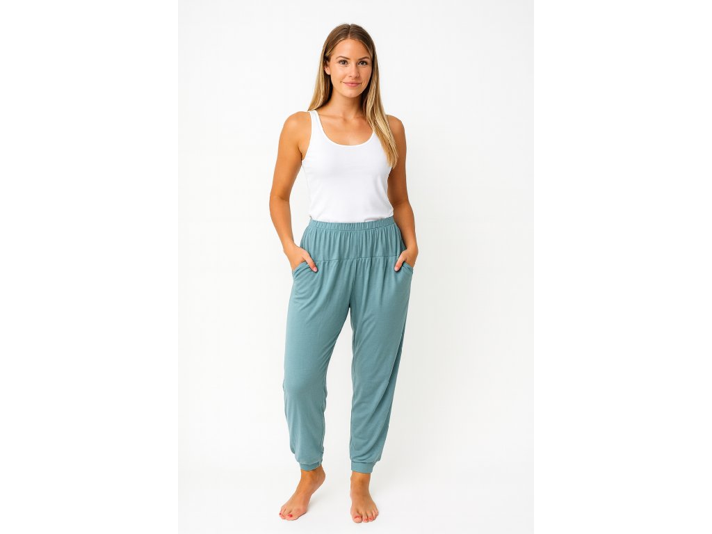Dámské teplákové kalhoty. Kalhoty mají v pase gumu a nohavice stažené do gumy.