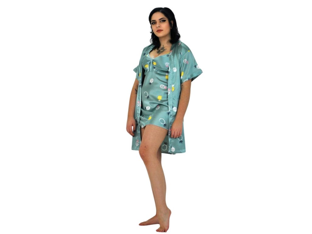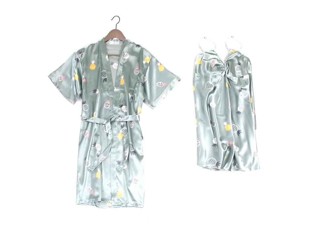 Saténová noční košilka se županem - ŠEDOZELENÁ s ananasy