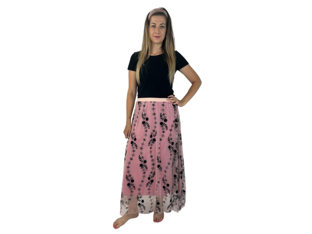 Sukně tylová s černými květy - růžová